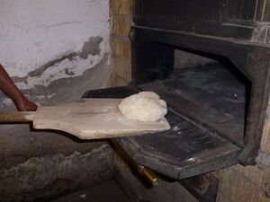 Aus großen Säcken wird das Mehl entnommen. Die benötigten Zutaten werden zusammengestellt. Alles wird zu einem Teig vermischt. Das Kneten des Teiges ist sehr anstrengend – eine Knetmaschine kann dabei helfen.