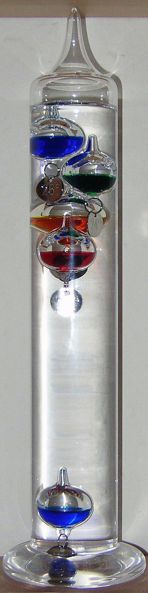 | Beschreibung | Thermometer nach dem von Galileis entdeckten Prinzip, dass sich die Dichte von Flüssigkeiten mit der Temperatur ändert. |