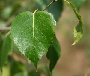 Die Blätter der Birke sind rautenförmig und 4 bis 7 cm lang. Der Blattrand ist doppelt gesägt und die Spitze des Blattes lang ausgezogen.