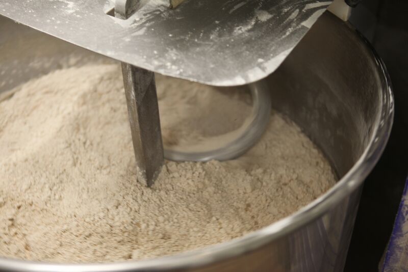 Beschreibung Mehl kommt in die Teigknetmaschine