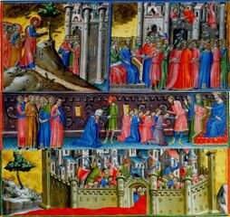 Originaltitel Oben: Jesus in Jerusalem, Zerstörung des Tempels. Mitte: Enthauptung der Juden durch die Feinde des Herrn. Unten: Kreuzfahrer erobern die Stadt und rächen die Kränkungen in Strömen von Blut. Darstellung um 1200 in England begonnen, im 14. Jahrhundert in Spanien fertiggestellt