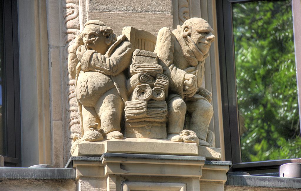 Originaltitel Denkmalgeschütztes Büro- und Geschäftshaus Brückenstraße 17, Köln. An der Fassade befinden sich Skulpturen, die Szenen aus der Märchen „Des Kaisers neue Kleider“ darstellen.