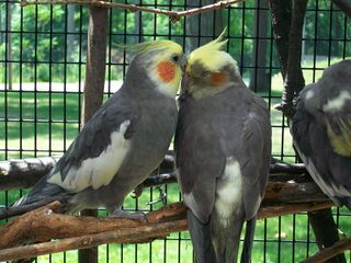 | Beschreibung | Nymphensittiche in einer Freivoliere |