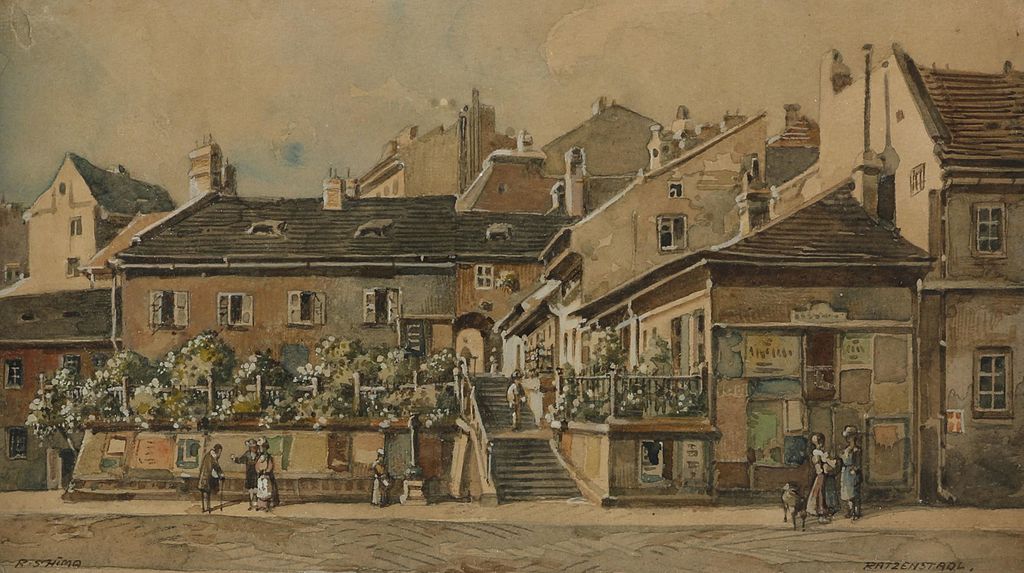 Originaltitel "Ratzenstadl", links unten signiert "R. Schima", Aquarell auf Papier, ca. 14 x 25 cm (fl. Wien c. 1900–1910)