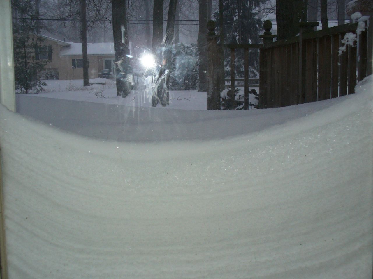 Beschreibung Viele Schichten Schnee sind an die Terrassentür geweht worden.