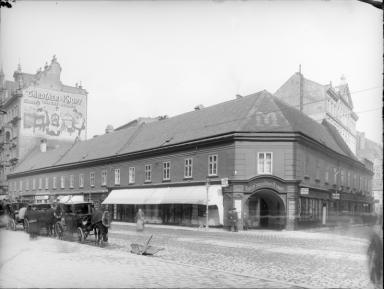 | Beschreibung | Ecke Taborstraße 20/Schmelzgasse, Das Haus "Zum goldenen Brunnen", um 1902 |
