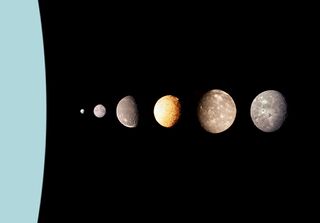 Originaltitel A montage of Uranus' large moons and one smaller moon: from left to right Puck, Miranda, Ariel, Umbriel, Titania and Oberon. Other moons are not yet photographed in detail.