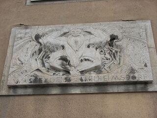 Originaltitel Der Wassergeist von Wilhelmsdorf, Natursteinrelief von Josef Schagerl, 1955, in der Eichenstraße 50-52, Wien-Meidling