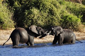 Afrikanische Elefanten brauchen in ihrer Nähe immer eine Wasserstelle, die sie zumindest einmal am Tag besuchen. Wenn genügend Wasser da ist, baden sie auch sehr gerne. Manchmal ragt nur die Spitze ihres Rüssels aus dem Wasser.