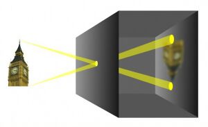 Wenn in einem abgedunkelten Kasten oder Raum Licht durch ein kleines Loch fällt, so müssen sich die Lichtstrahlen von allen Gegenständen außerhalb des Kastens an diesem kleinen Punkt kreuzen. Die Lichtstrahlen werden gebündelt.