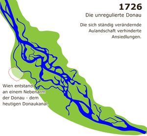 Lange Zeit suchte sich die Donau ihr Flussbett selbst. Bei Wien durchfloss sie eine 5 km breite Aulandschaft und hatte unzählige große und kleine Seitenarme. Ihr Verlauf änderte sich nach jedem Hochwasser. Ortschaften konnten nur am Rand des sumpfigen Augebietes entstehen.