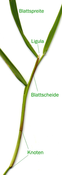 Der Übergang zwischen Halm und Blatt heißt Blattscheide. Hier wächst meist ein Blatthäutchen (Ligula). Es hat die Aufgabe, ein Eindringen von Schmutz oder Parasiten zwischen Halm und Blattscheide zu verhindern. Dieses kleine Blatthäutchen kann je nach Grasart sehr unterschiedlich aussehen. Deshalb wird es auch für die Artenbestimmung herangezogen.