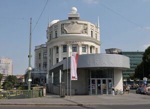 Am Ufer des Donaukanals steht die Urania. Es ist als ein großes, längliches Gebäude mit einer gut erkennbaren grünen Kuppel.