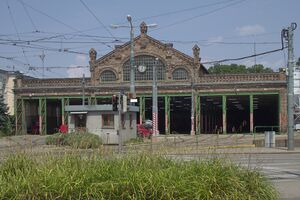 Die Remise besteht aus mehreren Hallen, die zwischen 1900 und 1913 im Schichtziegelstil erbaut worden sind.