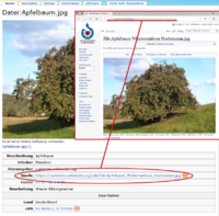 Eingebundene Mediendateien (etwa Bilder oder Videos) haben in der Regel Informationen zu den Urhebern und zum Lizenzstatus. Diese sind normalerweise unterhalb der Mediendatei ersichtlich und erscheinen nochmals durch Anklicken gesondert auf der Dateibeschreibungsseite.