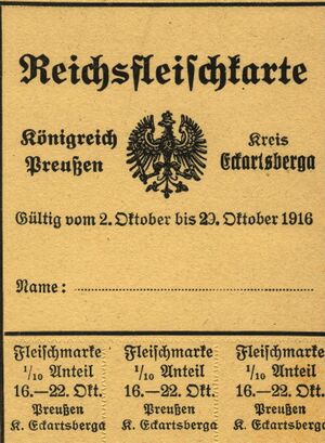 | + | [[Datei:lebensmittelkarte.jpg|thumb|300px|right|{{ImageCaption|Titel=Lebensmittelkarte für Fleisch|Urheber=Cethegus|Quelle={{ImageMetaSource|Quelle=https://commons.wikimedia.org/wiki/File:Fleischkarte1916.jpg|Linktext=}}|Lizenz={{ImageMetaLicense|URL=https://creativecommons.org/licenses/by-sa/3.0/deed.de|Lizenz=CC BY-SA 3.0}}}}]] | ||